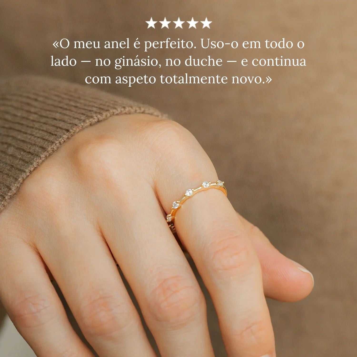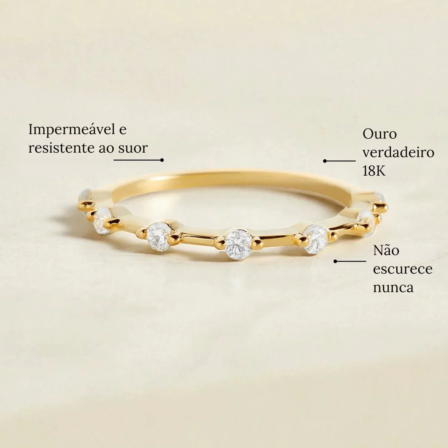 Um anel fino e luminoso que encarna a elegância minimalista. O seu design delicado e as pedras cintilantes proporcionam um brilho subtil, perfeito para usar sozinho para um toque refinado ou em conjunto com outros anéis para um estilo intemporal.