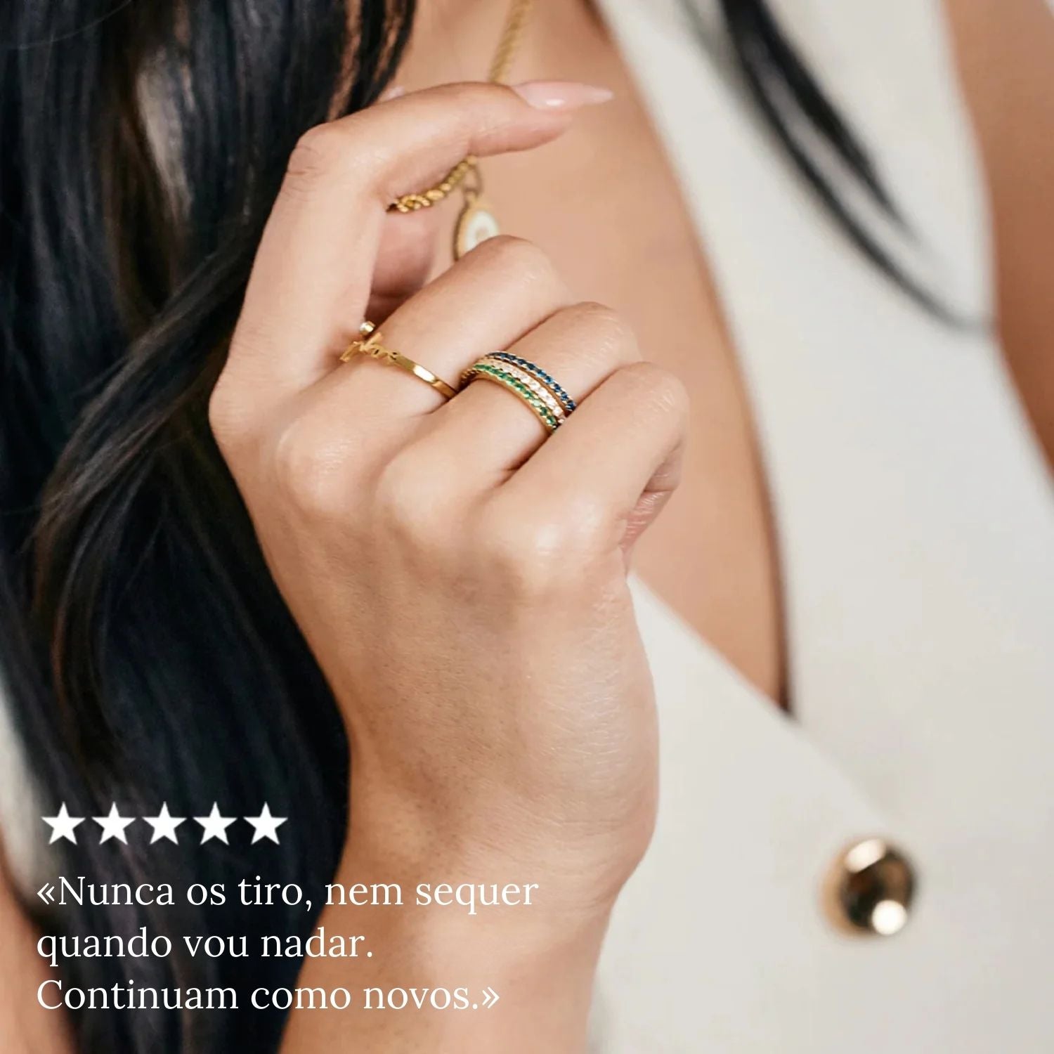 As nossas joias são pensadas para serem usadas ao longo de todo o dia. Cada peça é concebida e fabricada para durar. Não precisa, por isso, de as retirar — quer esteja a trabalhar, a sair com amigos ou até no duche.