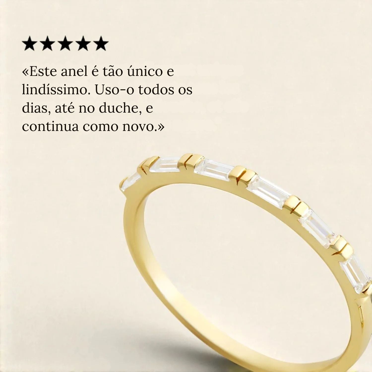 Um anel refinado com design minimalista, realçado pelo brilho intemporal de pedras cintilantes. Elegante e sofisticado, pode ser usado sozinho para um toque delicado ou em conjunto com outros anéis para mais glamour.