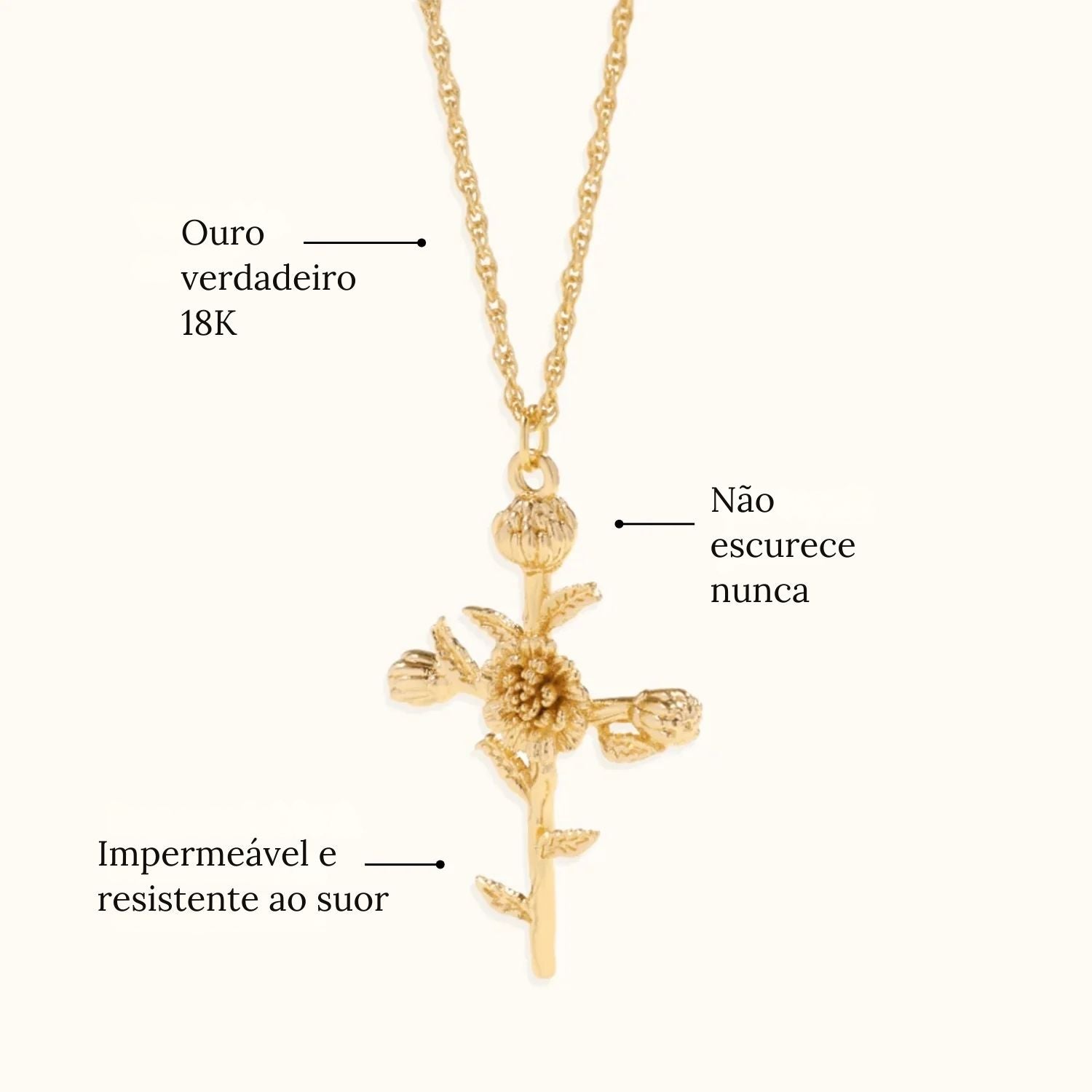Um colar cheio de elegância e simbolismo. O seu pendente em forma de cruz, finamente adornado com motivos florais, representa crescimento e renovação, criando uma joia ao mesmo tempo espiritual e refinada.