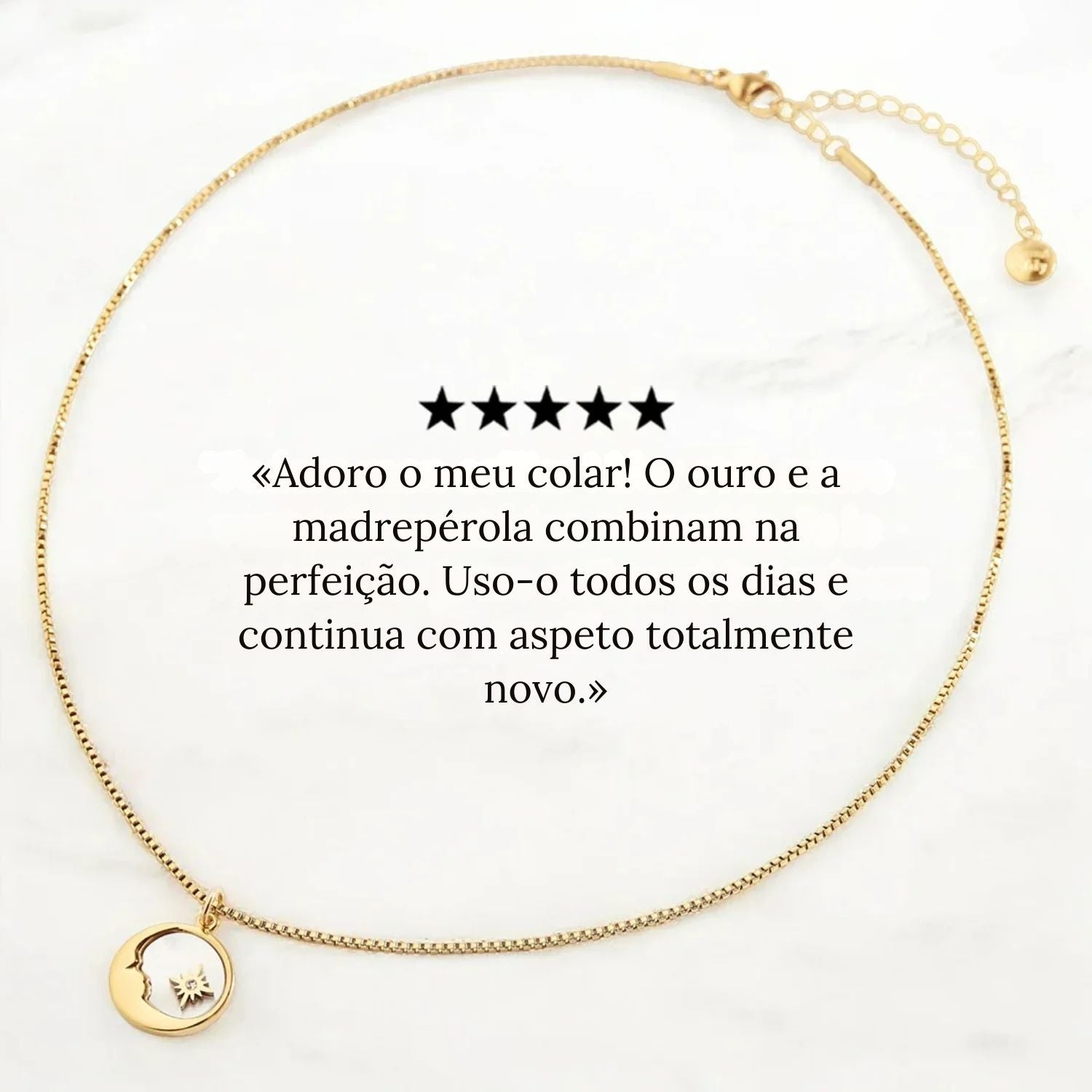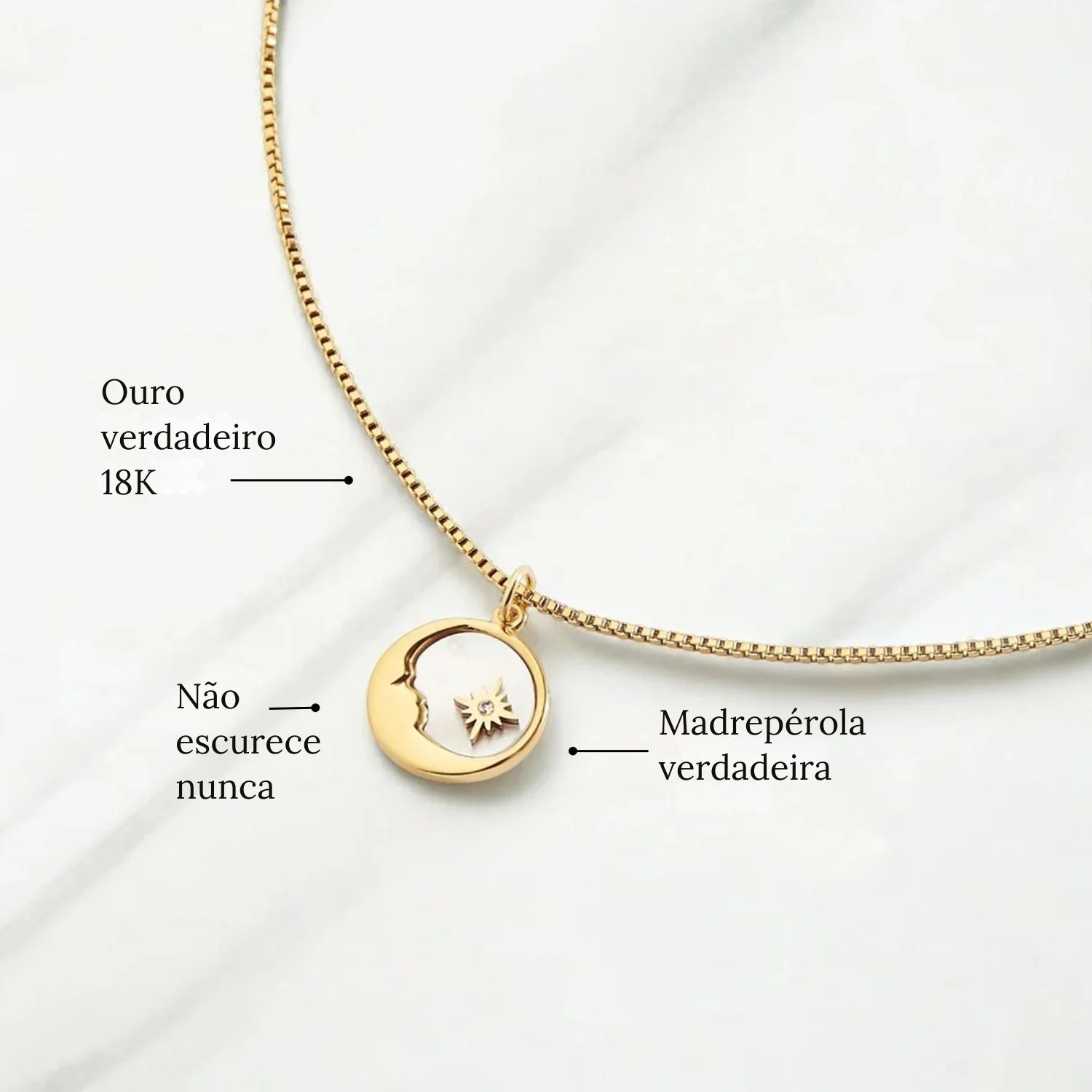 Um colar poético que captura a suavidade e a luz da lua. O seu pendente em madrepérola natural, suspenso numa corrente dourada delicada, combina beleza intemporal e elegância subtil. Pode ser usado sozinho para um brilho refinado ou sobreposto para um estilo moderno.
