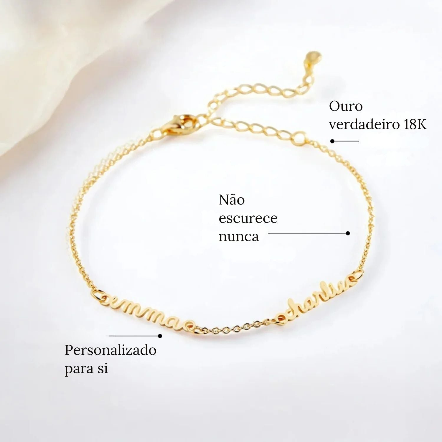Um toque de elegância personalizada. A pulseira fina com vários nomes permite-lhe manter os seus entes queridos sempre perto de si, com um estilo chique e discreto. Pode ser usada sozinha ou sobreposta para um look refinado e cheio de significado.