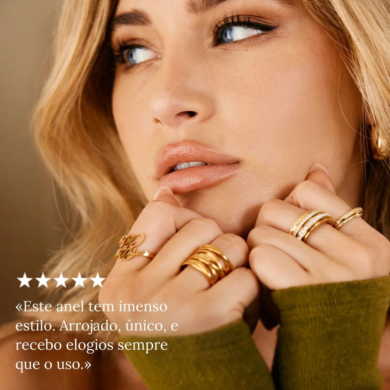 Um anel ousado com design escultórico e contemporâneo. As suas linhas entrelaçadas criam uma textura impressionante e um estilo único que atrai imediatamente o olhar. Ideal para quem gosta de joias expressivas, valoriza tanto um look discreto como um visual sofisticado para a noite.