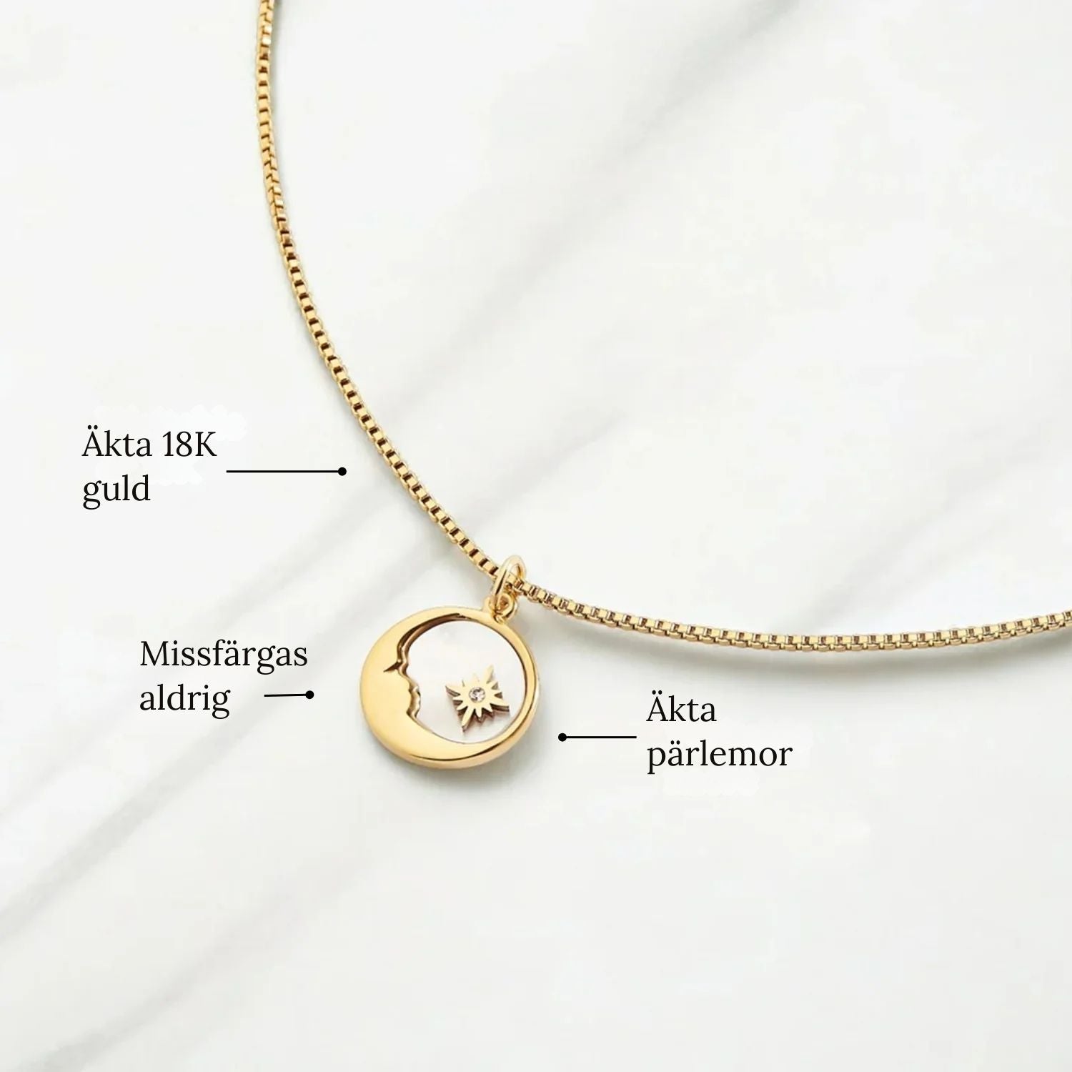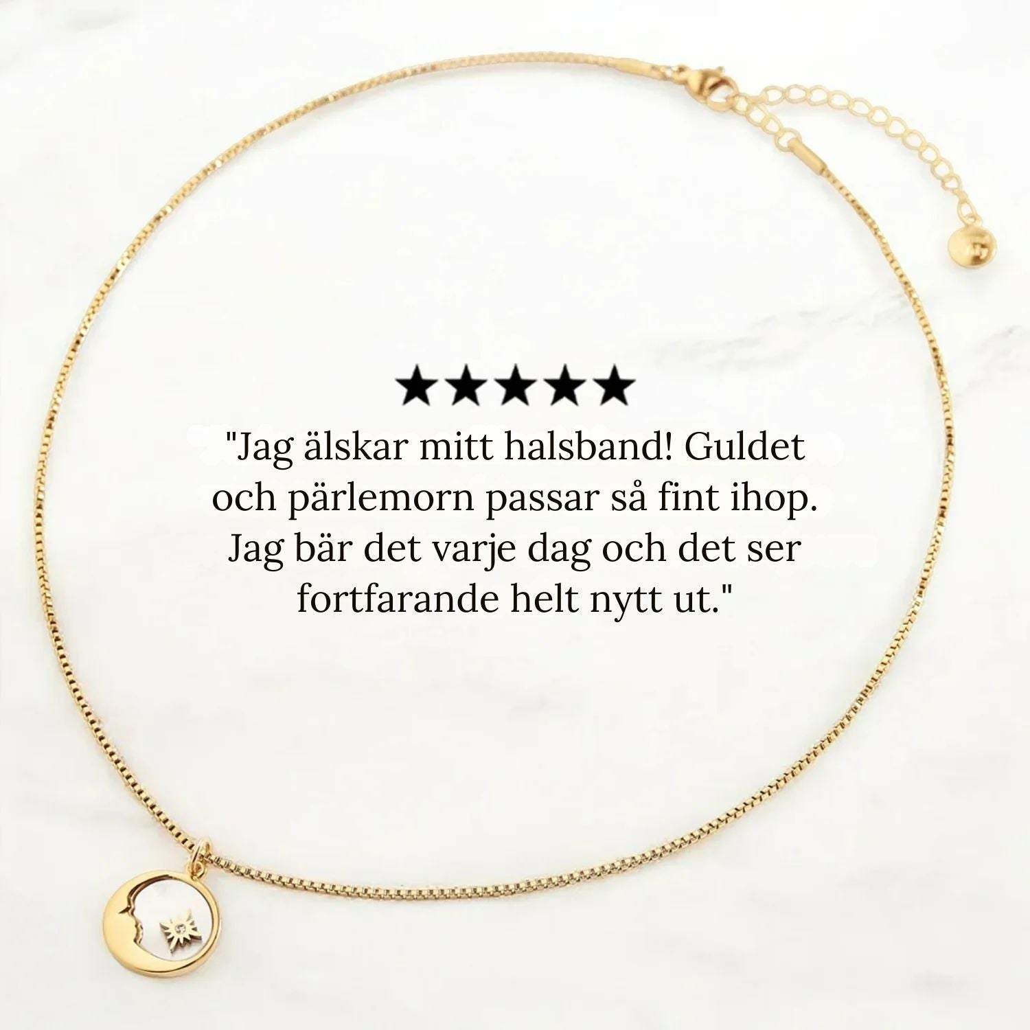 Ett poetiskt halsband som fångar månens mjukhet och ljus. Hänget i naturlig pärlemor, upphängt i en fin guldfärgad kedja, förenar tidlös skönhet med skir elegans. Bär det ensamt för ett raffinerat skimmer eller i lager för en trendig stil.