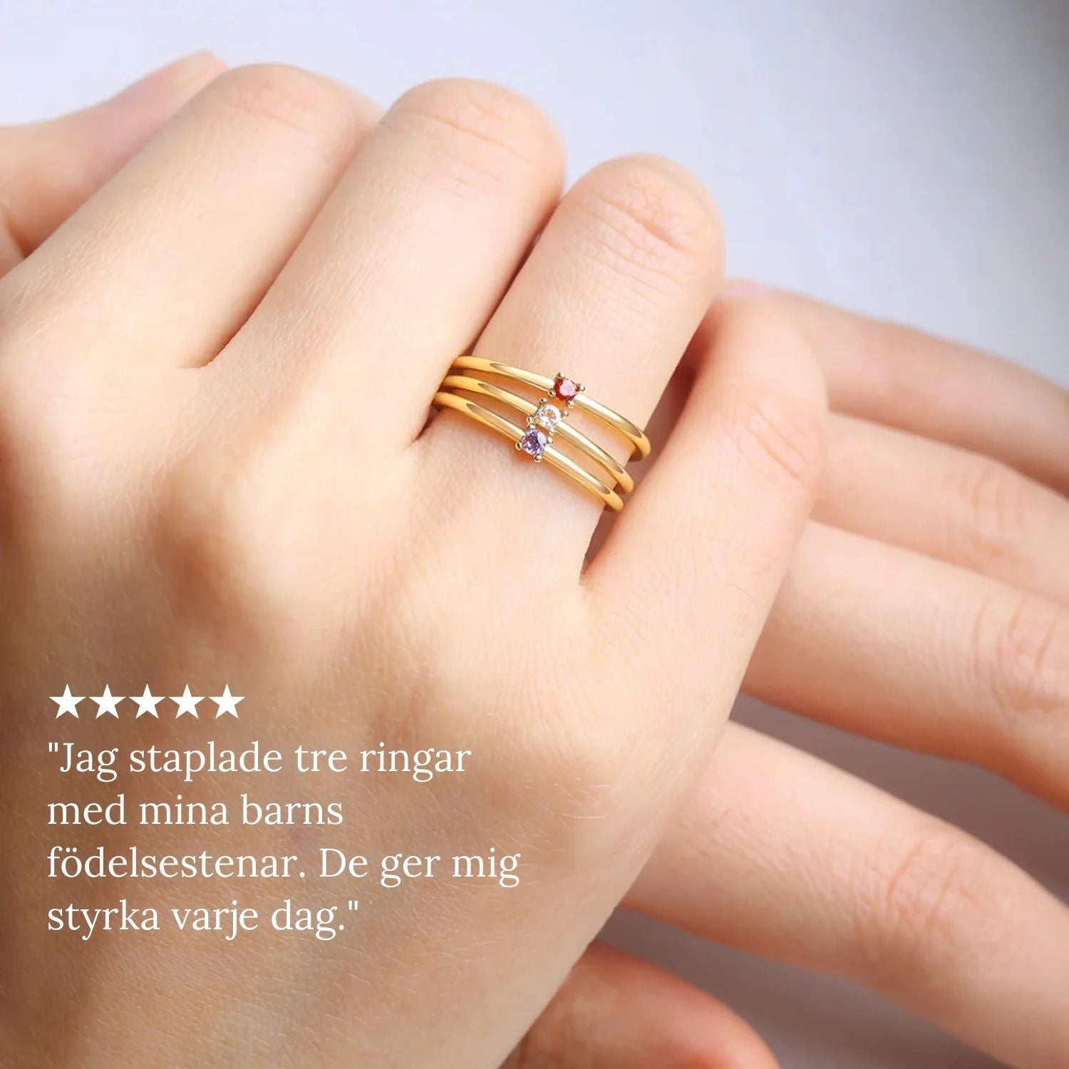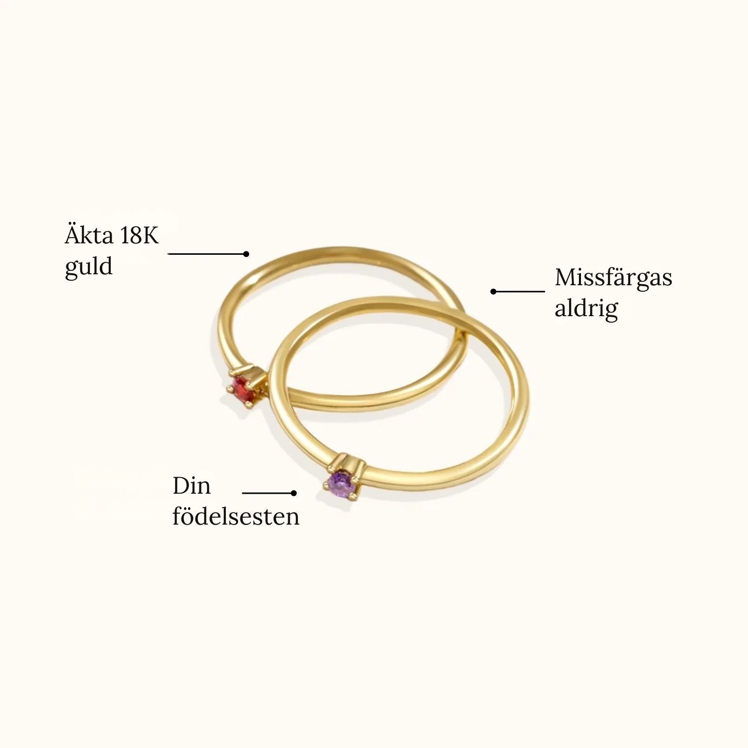 En tunn och elegant ring, prydd med en diskret färgad födelsesten. Samtidigt subtil och meningsfull – vacker att bära ensam för en lätt accent eller tillsammans med andra ringar för en personligt sammansatt stil. Perfekt för att fira din födelsemånad eller ge bort som ett symboliskt smycke till någon du håller kär.